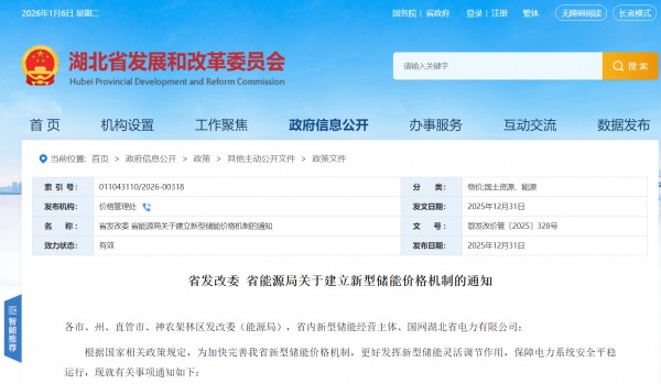據全球液流電池網獲悉,2026年1月4日,湖北省發展改革委、湖北省能源局發布《關于建立新型儲能價格 ...