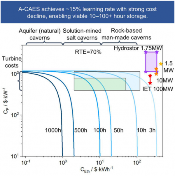 基于這些見(jiàn)解,該團(tuán)隊(duì)進(jìn)行了貼現(xiàn)現(xiàn)金流(DCF)分析,以確定A-CAES項(xiàng)目在經(jīng)濟(jì)上可行的條件。往返效率(RTE)假設(shè)為70%,反映了當(dāng)前項(xiàng)目的性能,價(jià)格投入來(lái)自最近的安裝。DCF分析考慮了一系列儲(chǔ)能持續(xù)時(shí)間:3、10、50、100、500和1000小時(shí)。